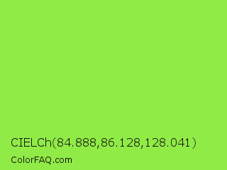CIELCh 84.888,86.128,128.041 Color is a normal green color and the nearest color is Kiwi #8ee53f. Hex code #90eb46 and RGB value is rgb(144,235,70). In RGB color space, this color is composed of 56% red, 92% green, 27% blue, In CMYK color space, this color is composed of 39% cyan, 0% magenta, 70% yellow , 8% black , In HSL color space, this color has a hue angle of 93° , 80% saturation and 60% lightness.