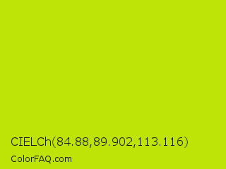 CIELCh 84.88,89.902,113.116 Color is a normal yellow color and the nearest color is Fuego #bede0d. Hex code #bde307 and RGB value is rgb(189,227,7). In RGB color space, this color is composed of 74% red, 89% green, 3% blue, In CMYK color space, this color is composed of 17% cyan, 0% magenta, 97% yellow , 11% black , In HSL color space, this color has a hue angle of 70° , 94% saturation and 46% lightness.