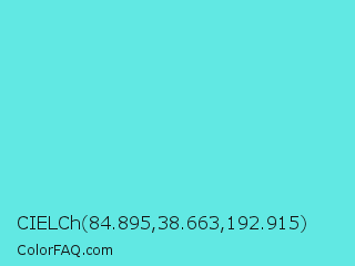 CIELCh 84.895,38.663,192.915 Color is a light cyan color and the nearest color is Turquoise Blue #6cdae7. Hex code #61e8e3 and RGB value is rgb(97,232,227). In RGB color space, this color is composed of 38% red, 91% green, 89% blue, In CMYK color space, this color is composed of 58% cyan, 0% magenta, 2% yellow , 9% black , In HSL color space, this color has a hue angle of 178° , 75% saturation and 65% lightness.