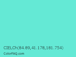 CIELCh 84.89,41.178,181.754 Color is a light cyan color and the nearest color is Aquamarine Blue #71d9e2. Hex code #64e9d5 and RGB value is rgb(100,233,213). In RGB color space, this color is composed of 39% red, 91% green, 84% blue, In CMYK color space, this color is composed of 57% cyan, 0% magenta, 9% yellow , 9% black , In HSL color space, this color has a hue angle of 171° , 75% saturation and 65% lightness.