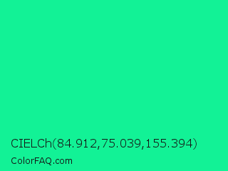 CIELCh 84.912,75.039,155.394 Color is a normal green color and the nearest color is Medium Spring Green #00fa9a. Hex code #12f296 and RGB value is rgb(18,242,150). In RGB color space, this color is composed of 7% red, 95% green, 59% blue, In CMYK color space, this color is composed of 93% cyan, 0% magenta, 38% yellow , 5% black , In HSL color space, this color has a hue angle of 155° , 90% saturation and 51% lightness.