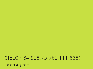 CIELCh 84.918,75.761,111.838 Color is a normal yellow color and the nearest color is Pear #d1e231. Hex code #c7e042 and RGB value is rgb(199,224,66). In RGB color space, this color is composed of 78% red, 88% green, 26% blue, In CMYK color space, this color is composed of 11% cyan, 0% magenta, 71% yellow , 12% black , In HSL color space, this color has a hue angle of 69° , 72% saturation and 57% lightness.