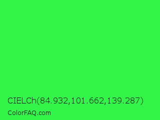 CIELCh 84.932,101.662,139.287 Color is a normal green color and the nearest color is Lime Green #32cd32. Hex code #33f448 and RGB value is rgb(51,244,72). In RGB color space, this color is composed of 20% red, 96% green, 28% blue, In CMYK color space, this color is composed of 79% cyan, 0% magenta, 70% yellow , 4% black , In HSL color space, this color has a hue angle of 127° , 90% saturation and 58% lightness.