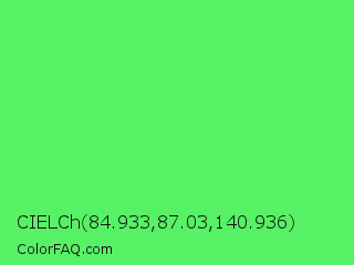 CIELCh 84.933,87.03,140.936 Color is a light green color and the nearest color is Screamin Green #66ff66. Hex code #57f165 and RGB value is rgb(87,241,101). In RGB color space, this color is composed of 34% red, 95% green, 40% blue, In CMYK color space, this color is composed of 64% cyan, 0% magenta, 58% yellow , 5% black , In HSL color space, this color has a hue angle of 125° , 85% saturation and 64% lightness.
