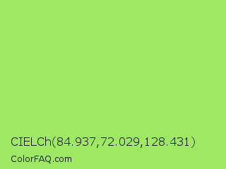 CIELCh 84.937,72.029,128.431 Color is a light green color and the nearest color is Inchworm #b2ec5d. Hex code #9ee863 and RGB value is rgb(158,232,99). In RGB color space, this color is composed of 62% red, 91% green, 39% blue, In CMYK color space, this color is composed of 32% cyan, 0% magenta, 57% yellow , 9% black , In HSL color space, this color has a hue angle of 93° , 74% saturation and 65% lightness.
