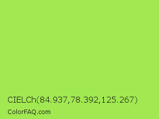 CIELCh 84.937,78.392,125.267 Color is a light green color and the nearest color is Conifer #acdd4d. Hex code #a1e851 and RGB value is rgb(161,232,81). In RGB color space, this color is composed of 63% red, 91% green, 32% blue, In CMYK color space, this color is composed of 31% cyan, 0% magenta, 65% yellow , 9% black , In HSL color space, this color has a hue angle of 88° , 77% saturation and 61% lightness.