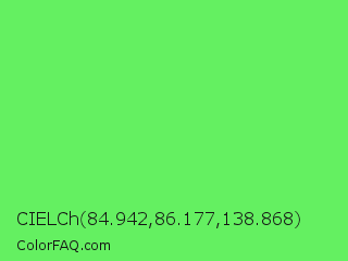 CIELCh 84.942,86.177,138.868 Color is a light green color and the nearest color is Screamin Green #66ff66. Hex code #64f061 and RGB value is rgb(100,240,97). In RGB color space, this color is composed of 39% red, 94% green, 38% blue, In CMYK color space, this color is composed of 58% cyan, 0% magenta, 60% yellow , 6% black , In HSL color space, this color has a hue angle of 119° , 83% saturation and 66% lightness.