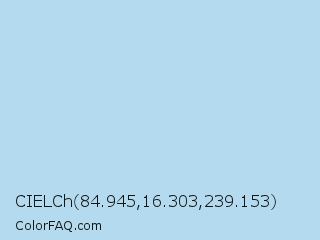 CIELCh 84.945,16.303,239.153 Color is a very light blue color and the nearest color is Light Blue #add8e6. Hex code #b3daee and RGB value is rgb(179,218,238). In RGB color space, this color is composed of 70% red, 85% green, 93% blue, In CMYK color space, this color is composed of 25% cyan, 8% magenta, 0% yellow , 7% black , In HSL color space, this color has a hue angle of 200° , 63% saturation and 82% lightness.