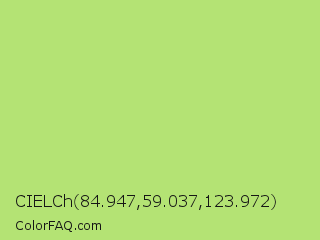 CIELCh 84.947,59.037,123.972 Color is a light green color and the nearest color is Yellow Green #c5e17a. Hex code #b4e374 and RGB value is rgb(180,227,116). In RGB color space, this color is composed of 71% red, 89% green, 45% blue, In CMYK color space, this color is composed of 21% cyan, 0% magenta, 49% yellow , 11% black , In HSL color space, this color has a hue angle of 85° , 66% saturation and 67% lightness.