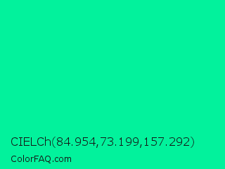 CIELCh 84.954,73.199,157.292 Color is a normal green color and the nearest color is Medium Spring Green #00fa9a. Hex code #02f29c and RGB value is rgb(2,242,156). In RGB color space, this color is composed of 1% red, 95% green, 61% blue, In CMYK color space, this color is composed of 99% cyan, 0% magenta, 36% yellow , 5% black , In HSL color space, this color has a hue angle of 159° , 98% saturation and 48% lightness.