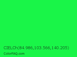 CIELCh 84.986,103.566,140.205 Color is a normal green color and the nearest color is Malachite #0bda51. Hex code #19f548 and RGB value is rgb(25,245,72). In RGB color space, this color is composed of 10% red, 96% green, 28% blue, In CMYK color space, this color is composed of 90% cyan, 0% magenta, 71% yellow , 4% black , In HSL color space, this color has a hue angle of 133° , 92% saturation and 53% lightness.