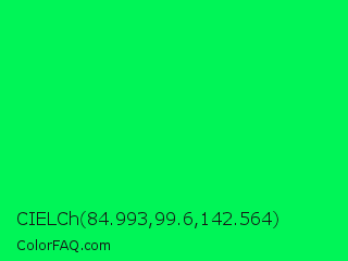 CIELCh 84.993,99.6,142.564 Color is a normal green color and the nearest color is Malachite #0bda51. Hex code #00f557 and RGB value is rgb(0,245,87). In RGB color space, this color is composed of 0% red, 96% green, 34% blue, In CMYK color space, this color is composed of 100% cyan, 0% magenta, 64% yellow , 4% black , In HSL color space, this color has a hue angle of 141° , 100% saturation and 48% lightness.