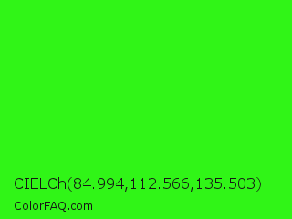 CIELCh 84.994,112.566,135.503 Color is a normal green color and the nearest color is Neon Green #39ff14. Hex code #30f517 and RGB value is rgb(48,245,23). In RGB color space, this color is composed of 19% red, 96% green, 9% blue, In CMYK color space, this color is composed of 80% cyan, 0% magenta, 91% yellow , 4% black , In HSL color space, this color has a hue angle of 113° , 92% saturation and 53% lightness.