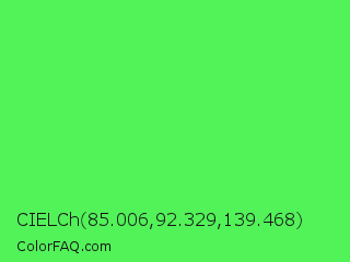 CIELCh 85.006,92.329,139.468 Color is a light green color and the nearest color is Screamin Green #66ff66. Hex code #52f259 and RGB value is rgb(82,242,89). In RGB color space, this color is composed of 32% red, 95% green, 35% blue, In CMYK color space, this color is composed of 66% cyan, 0% magenta, 63% yellow , 5% black , In HSL color space, this color has a hue angle of 123° , 86% saturation and 64% lightness.