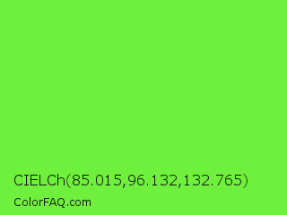 CIELCh 85.015,96.132,132.765 Color is a normal green color and the nearest color is Kiwi #8ee53f. Hex code #6ff03d and RGB value is rgb(111,240,61). In RGB color space, this color is composed of 44% red, 94% green, 24% blue, In CMYK color space, this color is composed of 54% cyan, 0% magenta, 75% yellow , 6% black , In HSL color space, this color has a hue angle of 103° , 86% saturation and 59% lightness.