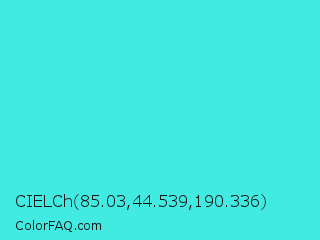 CIELCh 85.03,44.539,190.336 Color is a normal cyan color and the nearest color is Turquoise #40e0d0. Hex code #42ebe2 and RGB value is rgb(66,235,226). In RGB color space, this color is composed of 26% red, 92% green, 89% blue, In CMYK color space, this color is composed of 72% cyan, 0% magenta, 4% yellow , 8% black , In HSL color space, this color has a hue angle of 177° , 81% saturation and 59% lightness.