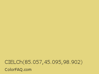CIELCh 85.057,45.095,98.902 Color is a light yellow color and the nearest color is Flax #eedc82. Hex code #e4d67f and RGB value is rgb(228,214,127). In RGB color space, this color is composed of 89% red, 84% green, 50% blue, In CMYK color space, this color is composed of 0% cyan, 6% magenta, 44% yellow , 11% black , In HSL color space, this color has a hue angle of 52° , 65% saturation and 70% lightness.