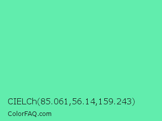 CIELCh 85.061,56.14,159.243 Color is a light green color and the nearest color is Medium Aquamarine #66ddaa. Hex code #61edad and RGB value is rgb(97,237,173). In RGB color space, this color is composed of 38% red, 93% green, 68% blue, In CMYK color space, this color is composed of 59% cyan, 0% magenta, 27% yellow , 7% black , In HSL color space, this color has a hue angle of 153° , 80% saturation and 65% lightness.