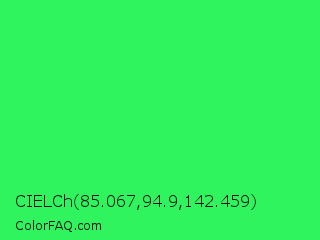 CIELCh 85.067,94.9,142.459 Color is a normal green color and the nearest color is UFO Green #3cd070. Hex code #30f45e and RGB value is rgb(48,244,94). In RGB color space, this color is composed of 19% red, 96% green, 37% blue, In CMYK color space, this color is composed of 80% cyan, 0% magenta, 61% yellow , 4% black , In HSL color space, this color has a hue angle of 134° , 90% saturation and 57% lightness.