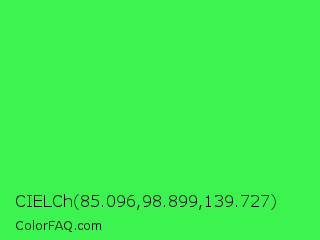 CIELCh 85.096,98.899,139.727 Color is a normal green color and the nearest color is UFO Green #3cd070. Hex code #3bf44f and RGB value is rgb(59,244,79). In RGB color space, this color is composed of 23% red, 96% green, 31% blue, In CMYK color space, this color is composed of 76% cyan, 0% magenta, 68% yellow , 4% black , In HSL color space, this color has a hue angle of 126° , 89% saturation and 59% lightness.