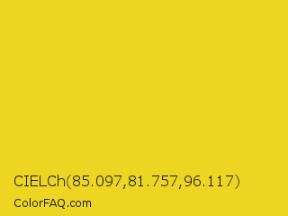 CIELCh 85.097,81.757,96.117 Color is a normal yellow color and the nearest color is Ripe Lemon #f4d81c. Hex code #edd61f and RGB value is rgb(237,214,31). In RGB color space, this color is composed of 93% red, 84% green, 12% blue, In CMYK color space, this color is composed of 0% cyan, 10% magenta, 87% yellow , 7% black , In HSL color space, this color has a hue angle of 53° , 85% saturation and 53% lightness.