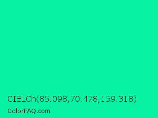 CIELCh 85.098,70.478,159.318 Color is a normal green color and the nearest color is Medium Spring Green #00fa9a. Hex code #08f2a3 and RGB value is rgb(8,242,163). In RGB color space, this color is composed of 3% red, 95% green, 64% blue, In CMYK color space, this color is composed of 97% cyan, 0% magenta, 33% yellow , 5% black , In HSL color space, this color has a hue angle of 160° , 94% saturation and 49% lightness.