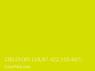 CIELCh 85.118,87.422,105.667 Color is a normal yellow color and the nearest color is Bitter Lemon #cae00d. Hex code #d4de00 and RGB value is rgb(212,222,0). In RGB color space, this color is composed of 83% red, 87% green, 0% blue, In CMYK color space, this color is composed of 5% cyan, 0% magenta, 100% yellow , 13% black , In HSL color space, this color has a hue angle of 63° , 100% saturation and 44% lightness.