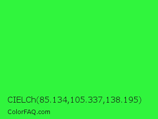 CIELCh 85.134,105.337,138.195 Color is a normal green color and the nearest color is Lime Green #32cd32. Hex code #30f53d and RGB value is rgb(48,245,61). In RGB color space, this color is composed of 19% red, 96% green, 24% blue, In CMYK color space, this color is composed of 80% cyan, 0% magenta, 75% yellow , 4% black , In HSL color space, this color has a hue angle of 124° , 91% saturation and 57% lightness.