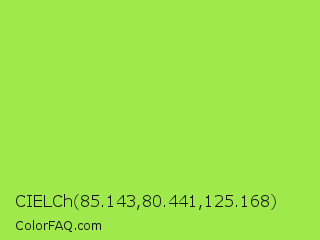 CIELCh 85.143,80.441,125.168 Color is a light green color and the nearest color is Conifer #acdd4d. Hex code #a0e94d and RGB value is rgb(160,233,77). In RGB color space, this color is composed of 63% red, 91% green, 30% blue, In CMYK color space, this color is composed of 31% cyan, 0% magenta, 67% yellow , 9% black , In HSL color space, this color has a hue angle of 88° , 78% saturation and 61% lightness.