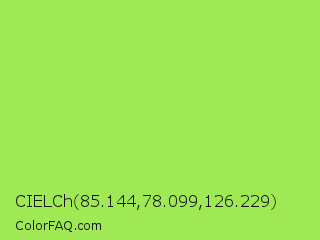 CIELCh 85.144,78.099,126.229 Color is a light green color and the nearest color is Conifer #acdd4d. Hex code #9fe954 and RGB value is rgb(159,233,84). In RGB color space, this color is composed of 62% red, 91% green, 33% blue, In CMYK color space, this color is composed of 32% cyan, 0% magenta, 64% yellow , 9% black , In HSL color space, this color has a hue angle of 90° , 77% saturation and 62% lightness.