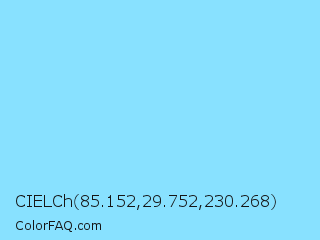 CIELCh 85.152,29.752,230.268 Color is a light blue color and the nearest color is Pale Cyan #87d3f8. Hex code #88e1ff and RGB value is rgb(136,225,255). In RGB color space, this color is composed of 53% red, 88% green, 100% blue, In CMYK color space, this color is composed of 47% cyan, 12% magenta, 0% yellow , 0% black , In HSL color space, this color has a hue angle of 195° , 100% saturation and 77% lightness.
