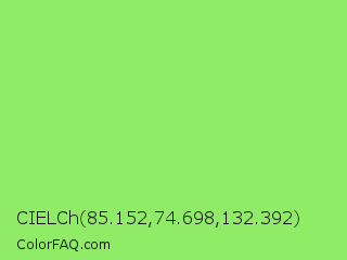 CIELCh 85.152,74.698,132.392 Color is a light green color and the nearest color is Pastel Green #77dd77. Hex code #90eb66 and RGB value is rgb(144,235,102). In RGB color space, this color is composed of 56% red, 92% green, 40% blue, In CMYK color space, this color is composed of 39% cyan, 0% magenta, 57% yellow , 8% black , In HSL color space, this color has a hue angle of 101° , 77% saturation and 66% lightness.