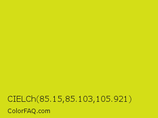 CIELCh 85.15,85.103,105.921 Color is a normal yellow color and the nearest color is Barberry #ded717. Hex code #d4de17 and RGB value is rgb(212,222,23). In RGB color space, this color is composed of 83% red, 87% green, 9% blue, In CMYK color space, this color is composed of 5% cyan, 0% magenta, 90% yellow , 13% black , In HSL color space, this color has a hue angle of 63° , 81% saturation and 48% lightness.