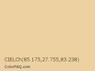 CIELCh 85.175,27.755,83.238 Color is a light orange color and the nearest color is Maize #f5d5a0. Hex code #eed1a1 and RGB value is rgb(238,209,161). In RGB color space, this color is composed of 93% red, 82% green, 63% blue, In CMYK color space, this color is composed of 0% cyan, 12% magenta, 32% yellow , 7% black , In HSL color space, this color has a hue angle of 37° , 69% saturation and 78% lightness.