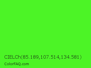 CIELCh 85.189,107.514,134.581 Color is a normal green color and the nearest color is Neon Green #39ff14. Hex code #4cf426 and RGB value is rgb(76,244,38). In RGB color space, this color is composed of 30% red, 96% green, 15% blue, In CMYK color space, this color is composed of 69% cyan, 0% magenta, 84% yellow , 4% black , In HSL color space, this color has a hue angle of 109° , 90% saturation and 55% lightness.