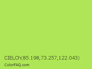 CIELCh 85.198,73.257,122.043 Color is a light green color and the nearest color is Inchworm #b2ec5d. Hex code #afe657 and RGB value is rgb(175,230,87). In RGB color space, this color is composed of 69% red, 90% green, 34% blue, In CMYK color space, this color is composed of 24% cyan, 0% magenta, 62% yellow , 10% black , In HSL color space, this color has a hue angle of 83° , 74% saturation and 62% lightness.