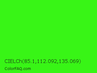 CIELCh 85.1,112.092,135.069 Color is a normal green color and the nearest color is Neon Green #39ff14. Hex code #38f516 and RGB value is rgb(56,245,22). In RGB color space, this color is composed of 22% red, 96% green, 9% blue, In CMYK color space, this color is composed of 77% cyan, 0% magenta, 91% yellow , 4% black , In HSL color space, this color has a hue angle of 111° , 92% saturation and 52% lightness.