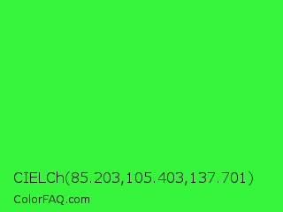 CIELCh 85.203,105.403,137.701 Color is a normal green color and the nearest color is Neon Green #39ff14. Hex code #36f53b and RGB value is rgb(54,245,59). In RGB color space, this color is composed of 21% red, 96% green, 23% blue, In CMYK color space, this color is composed of 78% cyan, 0% magenta, 76% yellow , 4% black , In HSL color space, this color has a hue angle of 122° , 91% saturation and 59% lightness.