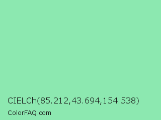 CIELCh 85.212,43.694,154.538 Color is a light green color and the nearest color is Teal Deer #99e6b3. Hex code #8ce8b0 and RGB value is rgb(140,232,176). In RGB color space, this color is composed of 55% red, 91% green, 69% blue, In CMYK color space, this color is composed of 40% cyan, 0% magenta, 24% yellow , 9% black , In HSL color space, this color has a hue angle of 143° , 67% saturation and 73% lightness.