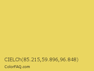 CIELCh 85.215,59.896,96.848 Color is a light yellow color and the nearest color is Confetti #e9d75a. Hex code #ead660 and RGB value is rgb(234,214,96). In RGB color space, this color is composed of 92% red, 84% green, 38% blue, In CMYK color space, this color is composed of 0% cyan, 9% magenta, 59% yellow , 8% black , In HSL color space, this color has a hue angle of 51° , 77% saturation and 65% lightness.