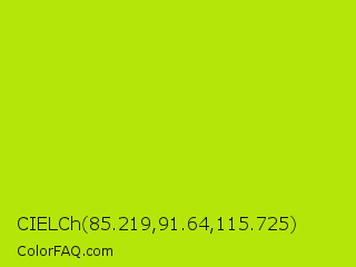 CIELCh 85.219,91.64,115.725 Color is a normal lime color and the nearest color is Inch Worm #b0e313. Hex code #b5e609 and RGB value is rgb(181,230,9). In RGB color space, this color is composed of 71% red, 90% green, 4% blue, In CMYK color space, this color is composed of 21% cyan, 0% magenta, 96% yellow , 10% black , In HSL color space, this color has a hue angle of 73° , 92% saturation and 47% lightness.