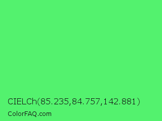 CIELCh 85.235,84.757,142.881 Color is a light green color and the nearest color is Screamin Green #66ff66. Hex code #53f26e and RGB value is rgb(83,242,110). In RGB color space, this color is composed of 33% red, 95% green, 43% blue, In CMYK color space, this color is composed of 66% cyan, 0% magenta, 55% yellow , 5% black , In HSL color space, this color has a hue angle of 130° , 86% saturation and 64% lightness.