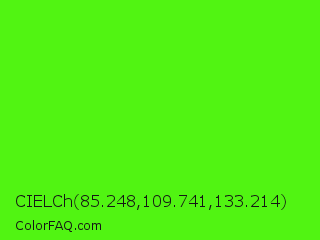 CIELCh 85.248,109.741,133.214 Color is a normal green color and the nearest color is Chlorophyll Green #4aff00. Hex code #51f412 and RGB value is rgb(81,244,18). In RGB color space, this color is composed of 32% red, 96% green, 7% blue, In CMYK color space, this color is composed of 67% cyan, 0% magenta, 93% yellow , 4% black , In HSL color space, this color has a hue angle of 103° , 91% saturation and 51% lightness.