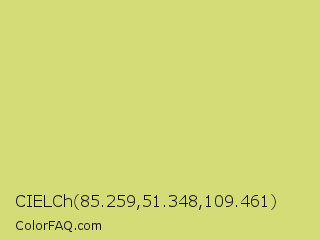 CIELCh 85.259,51.348,109.461 Color is a light yellow color and the nearest color is Yellow Green #c5e17a. Hex code #d4dc77 and RGB value is rgb(212,220,119). In RGB color space, this color is composed of 83% red, 86% green, 47% blue, In CMYK color space, this color is composed of 4% cyan, 0% magenta, 46% yellow , 14% black , In HSL color space, this color has a hue angle of 65° , 59% saturation and 66% lightness.