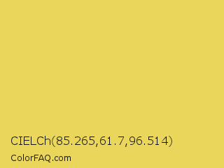 CIELCh 85.265,61.7,96.514 Color is a light yellow color and the nearest color is Confetti #e9d75a. Hex code #ebd65c and RGB value is rgb(235,214,92). In RGB color space, this color is composed of 92% red, 84% green, 36% blue, In CMYK color space, this color is composed of 0% cyan, 9% magenta, 61% yellow , 8% black , In HSL color space, this color has a hue angle of 51° , 78% saturation and 64% lightness.