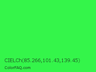 CIELCh 85.266,101.43,139.45 Color is a normal green color and the nearest color is Lime Green #32cd32. Hex code #34f54a and RGB value is rgb(52,245,74). In RGB color space, this color is composed of 20% red, 96% green, 29% blue, In CMYK color space, this color is composed of 79% cyan, 0% magenta, 70% yellow , 4% black , In HSL color space, this color has a hue angle of 127° , 91% saturation and 58% lightness.