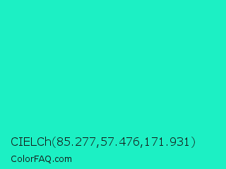 CIELCh 85.277,57.476,171.931 Color is a normal cyan color and the nearest color is Bright Turquoise #08e8de. Hex code #1cf0c4 and RGB value is rgb(28,240,196). In RGB color space, this color is composed of 11% red, 94% green, 77% blue, In CMYK color space, this color is composed of 88% cyan, 0% magenta, 18% yellow , 6% black , In HSL color space, this color has a hue angle of 168° , 88% saturation and 53% lightness.