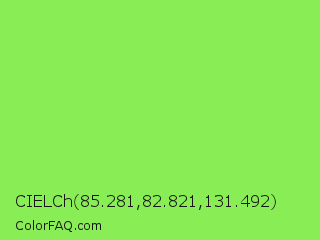 CIELCh 85.281,82.821,131.492 Color is a light green color and the nearest color is Kiwi #8ee53f. Hex code #89ed56 and RGB value is rgb(137,237,86). In RGB color space, this color is composed of 54% red, 93% green, 34% blue, In CMYK color space, this color is composed of 42% cyan, 0% magenta, 64% yellow , 7% black , In HSL color space, this color has a hue angle of 100° , 81% saturation and 63% lightness.
