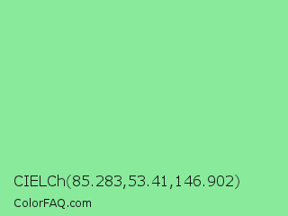 CIELCh 85.283,53.41,146.902 Color is a light green color and the nearest color is Light Green #90ee90. Hex code #89ea9c and RGB value is rgb(137,234,156). In RGB color space, this color is composed of 54% red, 92% green, 61% blue, In CMYK color space, this color is composed of 41% cyan, 0% magenta, 33% yellow , 8% black , In HSL color space, this color has a hue angle of 132° , 70% saturation and 73% lightness.