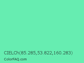 CIELCh 85.285,53.822,160.283 Color is a light green color and the nearest color is Medium Aquamarine #66ddaa. Hex code #66edb1 and RGB value is rgb(102,237,177). In RGB color space, this color is composed of 40% red, 93% green, 69% blue, In CMYK color space, this color is composed of 57% cyan, 0% magenta, 25% yellow , 7% black , In HSL color space, this color has a hue angle of 153° , 79% saturation and 66% lightness.